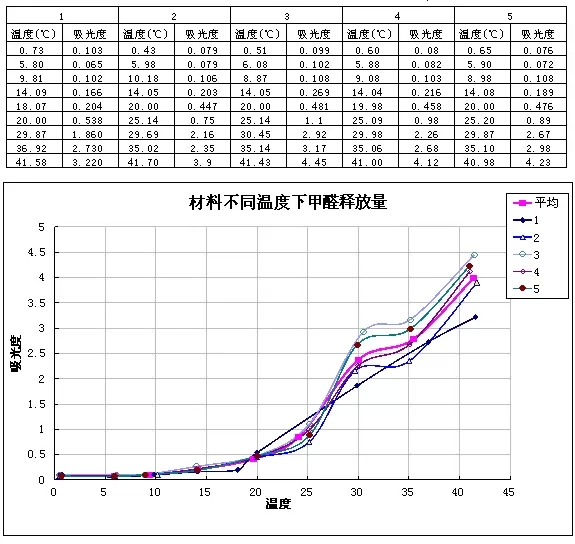 上图为参照GB/T17657-1999(干燥器法测甲醛释放量)的5组实验结果。 结果表明,板材中游离甲醛释放量与温度呈正相关,随温度增加而增加。当温度高于25度时,甲醛的释放量开始有着明显的增加。也就是说,地暖温度不超过25度时,地暖对地板里甲醛的影响就很微小。