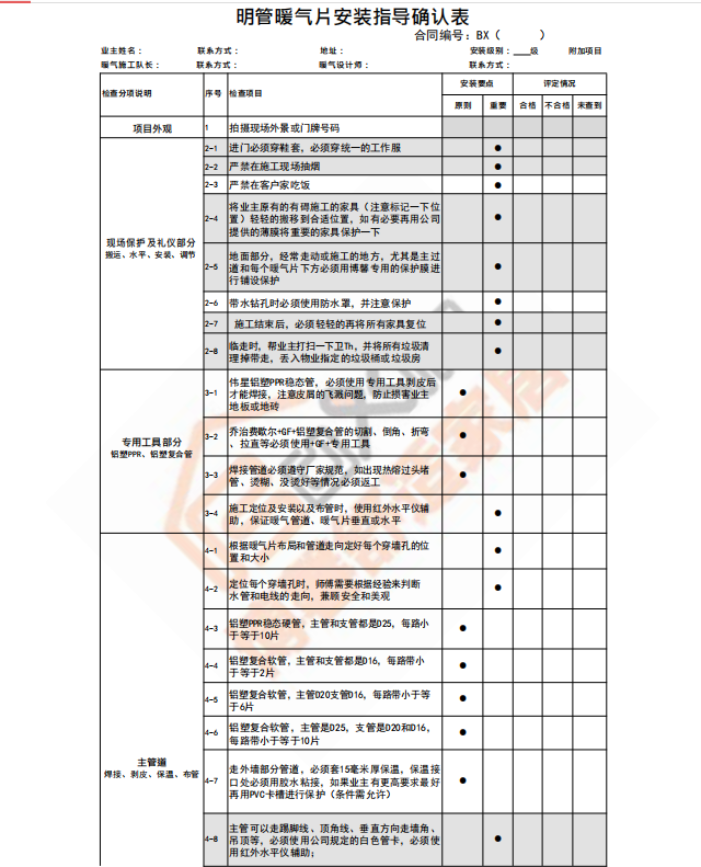博馨施工项目安装确认表之明管暖气片施工安装指导确认表